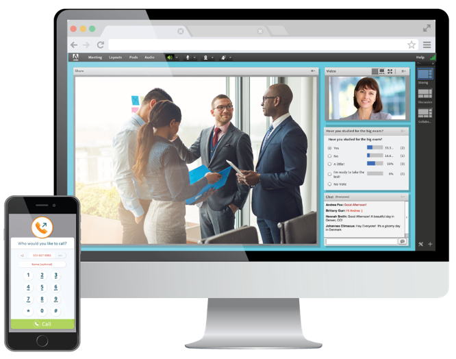 Adobe Connect room displayed on computer with MeetingOne AudioOne App displayed on phone: The perfect pair!